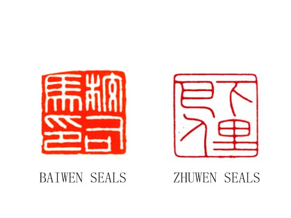 • Zhuwen Seals (Yang/Relief Carving): The characters are raised. The impression shows red characters on a white background.